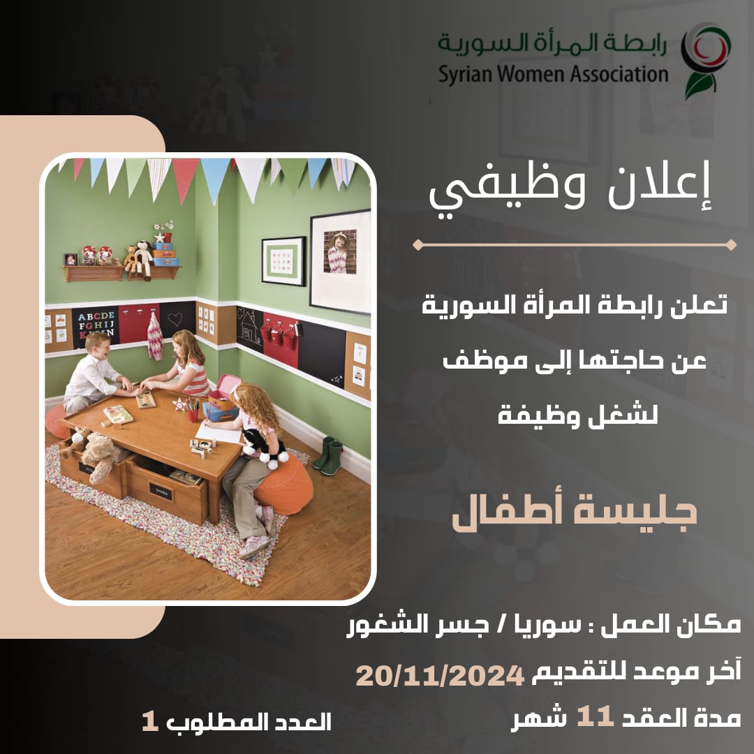 تعلن رابطة المرأة السورية عن حاجتها إلى موظفة لشغل وظيفة “جليسة أطفال “