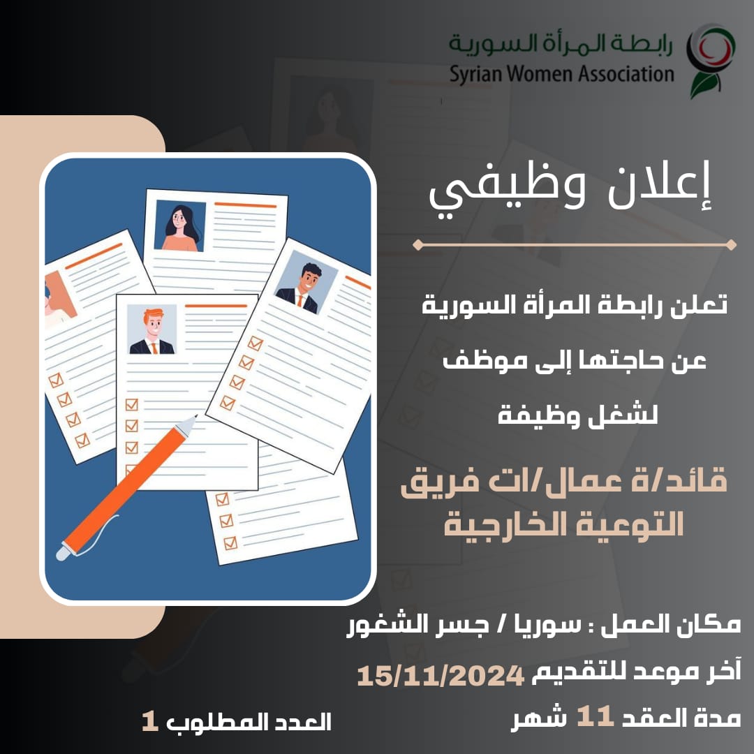 Job advertisement: “Leader of the External Outreach Workers Team” in the Syrian Women’s Association