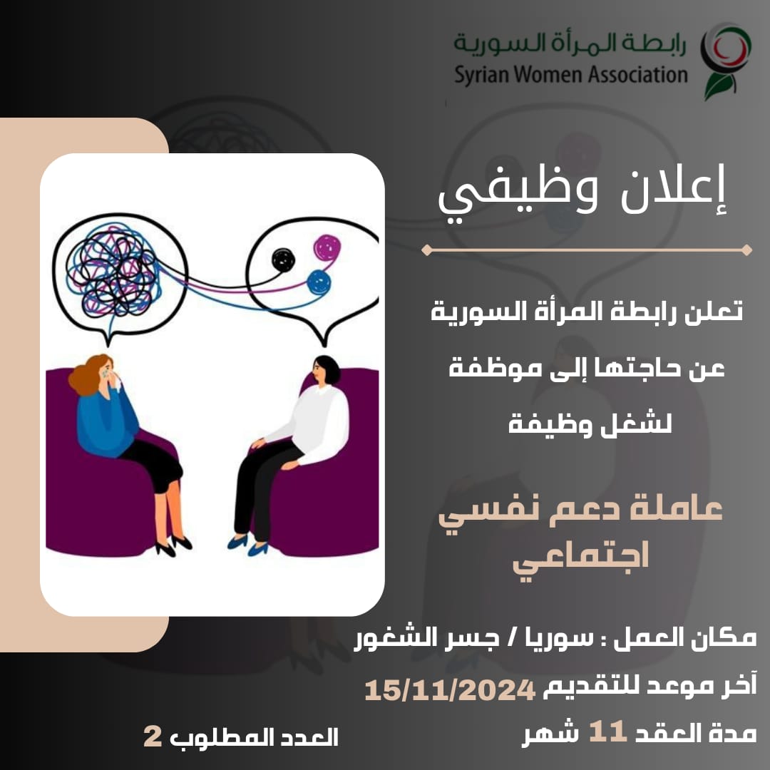 تعلن رابطة المرأة السورية عن حاجتها إلى موظف لشغل وظيفة “عاملة دعم تفسي اجتماعي “