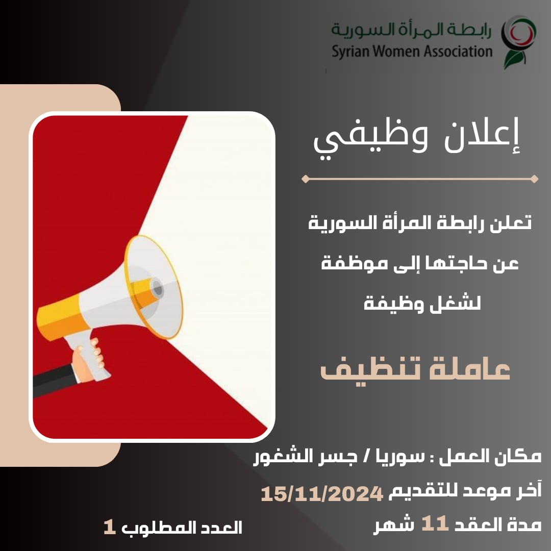 The Syrian Women’s Association announces its need for an employee to fill the position of “cleaning lady”